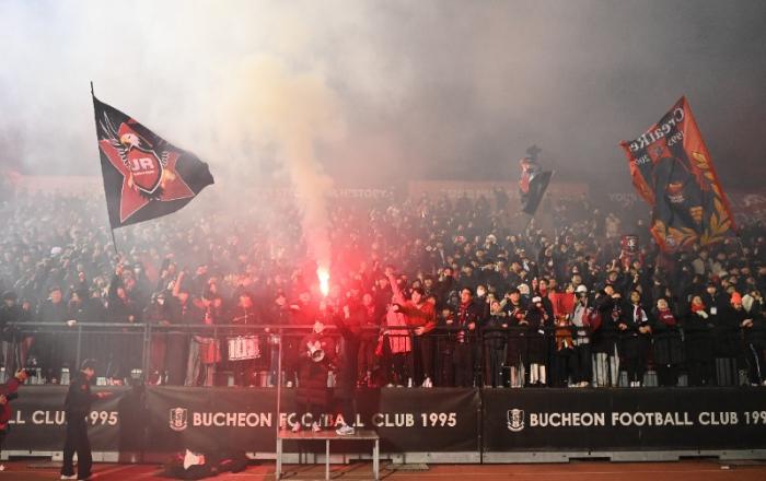 부천FC 승격 기념 세리머니에서 헤르메스가 홍염을 터트리며 기뻐하고 있다.[kbn연합방송=김진영 기자] 부천FC1995가 창단 18년 만에 구단 역사상 최초로 K리그1(1부리그) 무대에 오른다.부천FC1995는 최근 열린 수원FC와의 승강 플레이오프(PO)에
