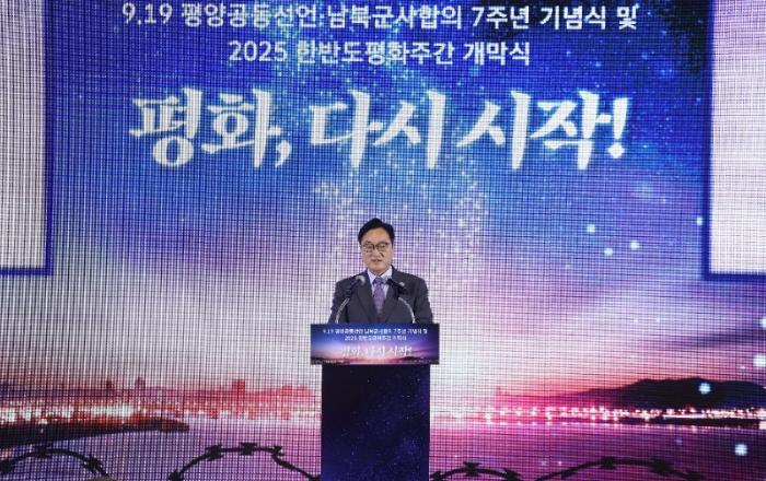 [kbn연합방송=김진영 기자] 우원식 국회의장은 19일 오후 파주 캠프그리브스 체육관에서 열린 9.19 평양공동선언·남북군사합의 7주년 기념식에 참석했다.우 의장은 이 자리에서 “남북관계는 여전히 단절되어 있고 한반도를 둘러싼 국제정세도 불안정하지만, 지금 우리는 분명