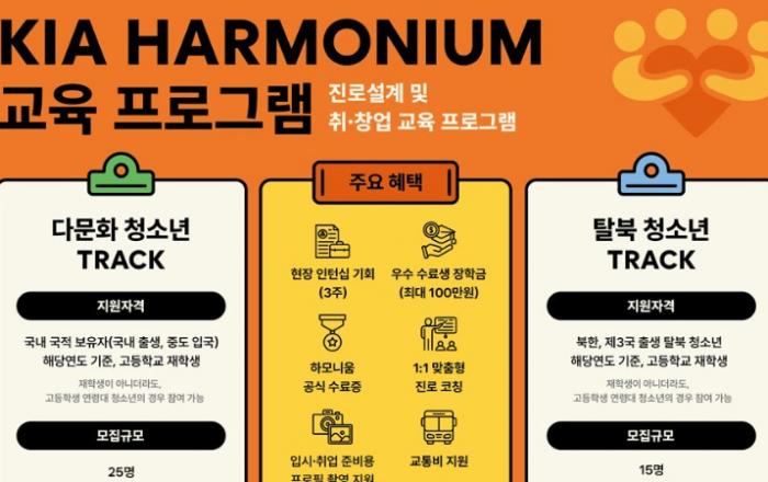 [kbn연합방송=김진영 기자] 기아가 19일(월)부터 다문화 청소년의 안정적인 사회 진출을 지원하는 ‘하모니움 교육 프로그램’ 3기 참여자를 모집한다.‘하모니움’은 기아가 다문화에 대한 사회적 인식을 개선하고 다문화 미래세대의 성장을 지원하기 위해 펼치는 사회공헌 사업