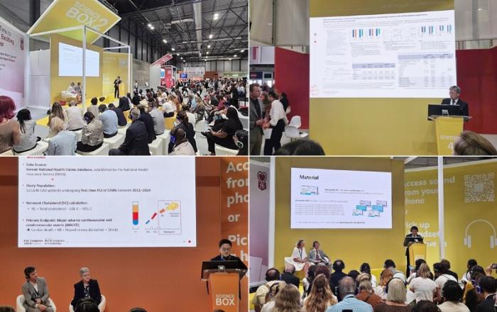 <사진> 스페인 마드리드에서 열린 유럽심장학회 연례학술대회(ESC Congress 2025)에 참석한 교수진들이 한미약품의 대표 심혈관질환 치료제의 임상적 이점에 대한 발표를 진행하고 있다. (시계방향으로, 행사장 전경, 동국대학교 의과대학 심장내과 이무용