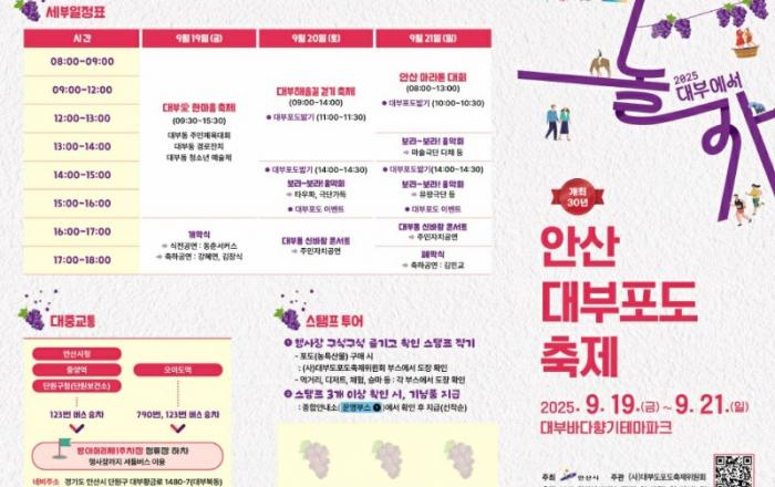 [kbn연합방송=김진영 기자] 안산시(시장 이민근)는 지난 19일 대부바다향기테마파크에서 ‘2025년 안산 대부포도축제’ 개막식을 개최하고 사흘간 축제를 펼친다고 20일 밝혔다.축제 첫날인 지난 19일에는 동춘서커스 식전 공연에 이어 개막식, ‘대부愛 한마음 축제’가