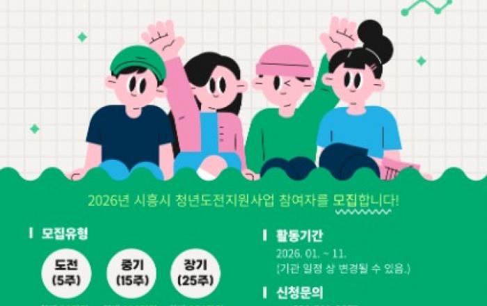 [kbn연합방송=김진영 기자] 시흥시는 취업과 사회 진출에 어려움을 겪고 있는 청년들의 재도전을 지원하기 위해 ‘2026년 청년도전지원사업’ 참여자 156명을 모집한다.‘청년도전지원사업’은 장기간 취업이나 교육ㆍ직업훈련에 참여하지 않은 청년을 대상으로 청년들에게 맞춤형