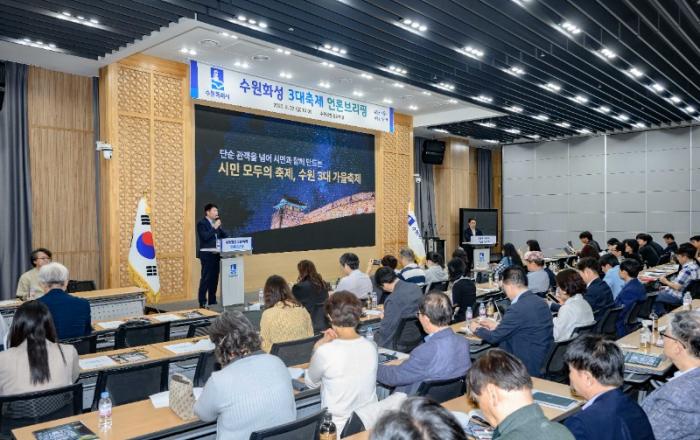 곽도용 수원시 문화청년체육국장이 ‘세계유산 수원화성 3대 가을축제 언론브리핑’에서 발언하고 있다.[kbn연합방송=김진영 기자] 세계문화유산 수원화성에서 열리는 3대 가을축제가 시작된다. 대한민국을 대표하는 글로벌 축제인 ‘제62회 수원화성문화제’는 27일부터 10월 4