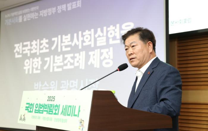 박승원 광명시장이 24일 국회의원회관 제2세미나실에서 열린 ‘기본사회를 실현하는 지방정부 정책발표회’에 참석해 광명시 사례를 발표하고 있다.[kbn연합방송=김진영 기자] 박승원 광명시장이 지속가능발전의 핵심 정책으로 대두되고 있는 ‘기본사회’에 대해 시민 참여가 성패를