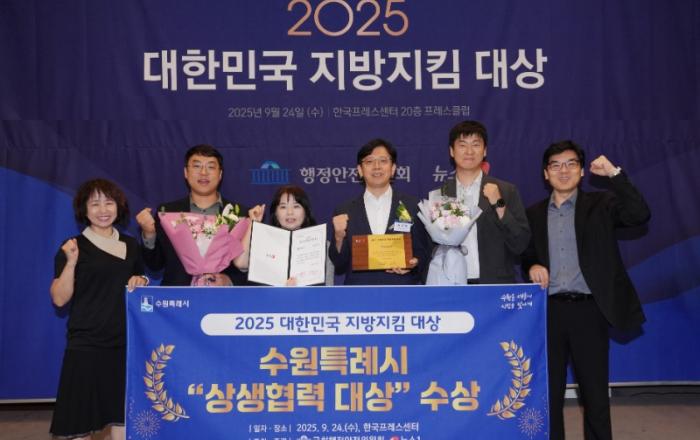 [kbn연합방송=김진영 기자] 수원특례시(시장 이재준)는 24일 한국프레스센터 프레스클럽에서 열린 ‘2025 대한민국 지방지킴 대상’에서 ‘상생협력’ 부문 대상을 받았다. 국회행정안전위원회와 뉴스1이 공동 주최하는 ‘대한민국 지방지킴 대상’은 지방소멸 방지와 인구절벽