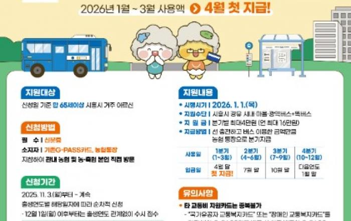 [kbn연합방송=김진영 기자] 시흥시(시장 임병택)는 만 65세 이상 어르신의 교통비 부담을 줄이고 이동 편의를 높이기 위해 ‘어르신 기본교통비 지원사업’을 본격 추진한다.이번 사업은 시흥시에 거주하는 만 65세 이상 어르신들에게 실제 사용한 교통비를 분기별로 최대 4