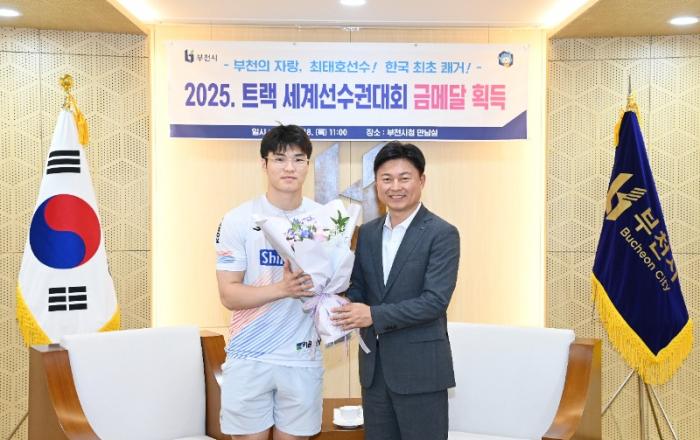 [kbn연합방송=김진영 기자] 부천 출신 주니어 사이클 간판 최태호 선수가 네덜란드 아펠도른에서 열린 ‘2025. 트랙 세계주니어선수권대회’에서 금메달 2개와 은메달 1개를 획득하며 뛰어난 성적을 거뒀다.이에 부천시는 지난 18일 시청 만남실에서 조용익 부천시장이 직접