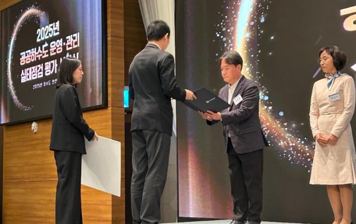 이동훈 부천시 수도자원국장이 ‘2025년 공공하수도 운영·관리 실태점검’에서 최우수상을 수상하고 있다.[kbn연합방송=김진영 기자] 부천시는 지난 27일 전남 여수에서 열린 ‘2025년 하수도 연찬회’에서 기후에너지환경부 주관 ‘2025년 공공하수도 운영·관리 실태점검