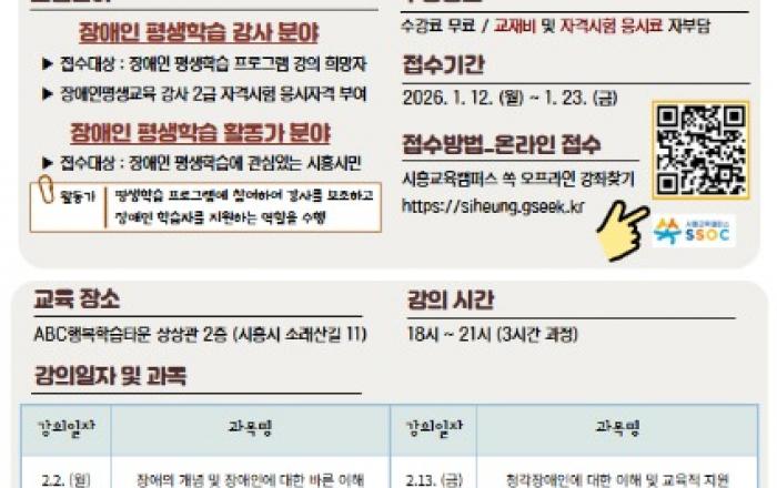 [kbn연합방송=김진영 기자] 시흥시(시장 임병택)는 오는 1월 23일까지 ‘2026년 장애인 평생학습 전문 강사와 활동가 양성 과정’ 수강생을 모집한다. 이번 과정은 장애인 평생학습 현장의 전문성을 높이고, 장애 유형과 학습 특성을 고려한 맞춤형 학습 서비스를 제공