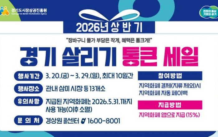 [kbn연합방송=김진영 기자] 시흥시(시장 임병택)는 고물가로 위축된 민생경제에 활력을 불어넣고 소상공인의 매출 증대를 돕기 위해 오는 3월 20일부터 29일까지 관내 전역에서 ‘2026년 상반기 경기 살리기 통큰 세일’을 개최한다. 올해 행사는 참여 규모가 크게 확대