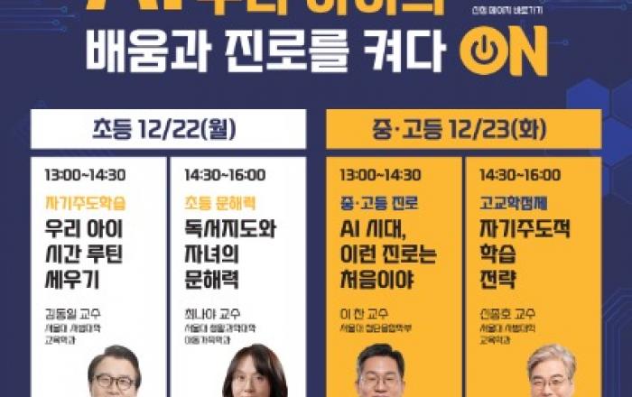[kbn연합방송=김진영 기자] 인공지능(AI) 시대를 살아갈 청소년의 학습·진로 역량을 주제로 한 강연 프로그램 ‘인공지능(AI) 시대 우리 아이의 배움과 진로를 켜다, 온(ON)’이 ‘대학과 도시 포럼 시즌2’의 시작을 알리는 첫 행사로 열린다.‘대학과 도시 포럼’은