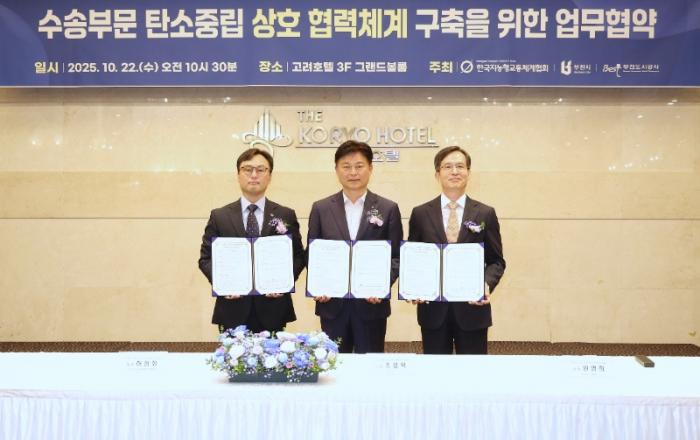 (왼쪽부터)허청회 ITS Korea 회장, 조용익 부천시장, 원명희 부천도시공사 사장이 협약체결 기념사진을 찍고 있다.[kbn연합방송=김진영 기자] 부천시는 지난 22일 부천 고려호텔에서 한국지능형교통체계협회(ITS Korea), 부천도시공사와 함께 ‘수송부문 탄소중립