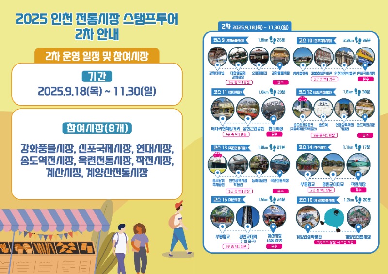 [kbn연합방송=김진영 기자] 인천광역시(시장 유정복)와 인천관광공사는 전통시장의 매력을 널리 알리고 지역 경제 활성화를 도모하기 위해 ‘매력으뜸 전통시장 육성사업’의 일환으로 오는 9월 18일부터 11월 30일까지 ‘2025년 제2차 인천 전통시장 모바일 스탬프투어’를 개최한다고 밝혔다.