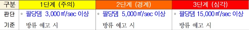 □ 서울시 ‘2025 풍수해 대비 재난안전대책 행동안내서’ 단계별 대응기준에 따르면 팔당댐 방류량 3,000톤/초 이상일 경우 한강 내 모든 선박(동력 및 무동력)의 운항이 통제된다.