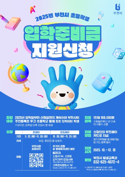 [kbn연합방송=김진영 기자] 부천시는 2025학년도 초등학교에 입학한 신입생을 대상으로, 가정의 교육비 부담을 덜고 원활한 학교생활 적응을 돕기 위해 1인당 10만 원의 입학준비금을 부천페이로 지급한다고 밝혔다.