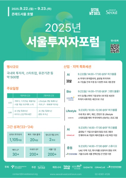 □ 서울시는 9월 22일(월)부터 23일(화)까지 양일간 여의도 콘래드호텔에서 「2025 서울투자자포럼(Seoul Investors Forum, SIF)」을 개최하고, 글로벌 투자자와 서울 혁신기업을 직접 연결하는 맞춤형 투자유치 행사를 진행한다고 밝혔다.
