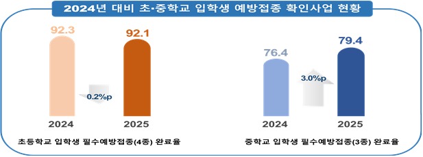 2025년 초·중학교 입학생 예방접종 완료율 92.1%, 79.4% 달성(9.24.수)