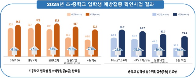[kbn연합방송=김진영 기자] 질병관리청(청장 임승관)과 교육부(부총리 겸 장관 최교진)는 9월 24일(수)에 2025년 초·중학교 입학생 예방접종 확인사업 결과를 발표했다.