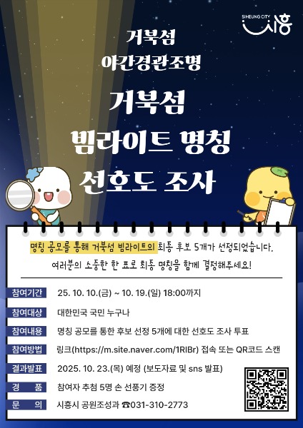 최종 명칭은 선호도 조사 결과를 반영해 10월 23일 시 보도자료 및 시흥시 공식 누리소통망(SNS)을 통해 발표될 예정이다. 아울러, 참여자 중 추첨을 통해 5명에게 2만 5천 원 상당의 손 선풍기가 경품으로 제공된다.