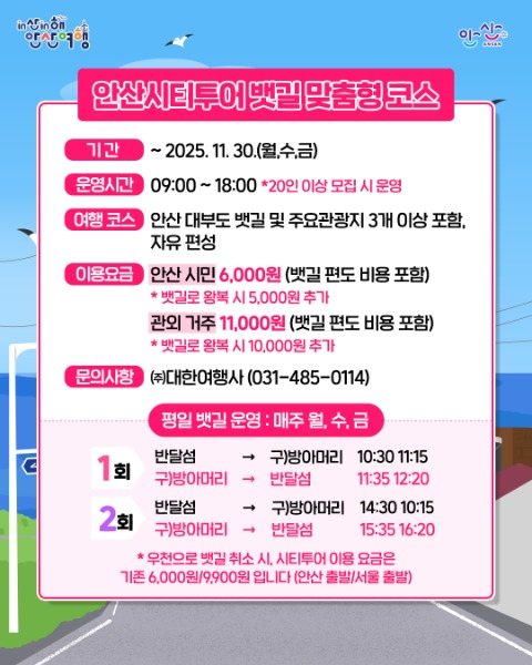 안산시티투어와 관련한 자세한 사항은 ㈜대한여행사(031-485-0114)로 문의하면 안내받을 수 있다.
