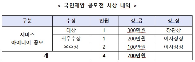 ㅇ 평가기준은 창의성, 실현 가능성, 정책반영 가능성, 논리성 등이며, 이를 종합적으로 평가하여 대상(국토교통부 장관상)을 포함한 총 4건의 수상작을 선정하고, 수상자에게는 총 700만원의 상금을 수여할 예정이다.