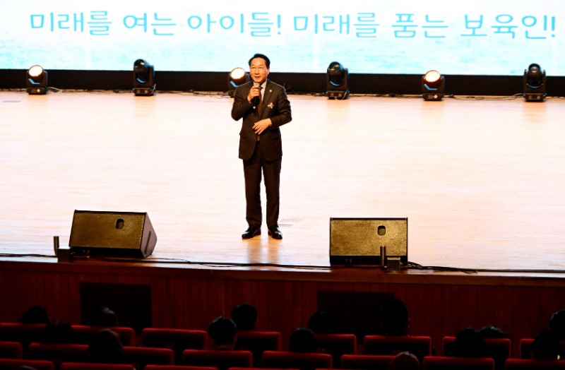 유정복 인천광역시장이 20일 연수구 글로벌캠퍼스에서 열린 '2025 인천광역시 보육인대회'에서 축사를 하고 있다.