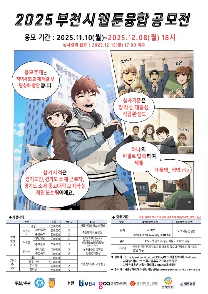 [kbn연합방송=김진영 기자] 부천시는 11월 10일부터 12월 8일까지 서울신학대학교 ‘이룸(eRoom)’ 플랫폼을 통해 지역 웹툰 창작 생태계를 조성하고 차세대 창의인재를 발굴하기 위한 ‘2025 부천시 웹툰융합공모전’을 개최한다.