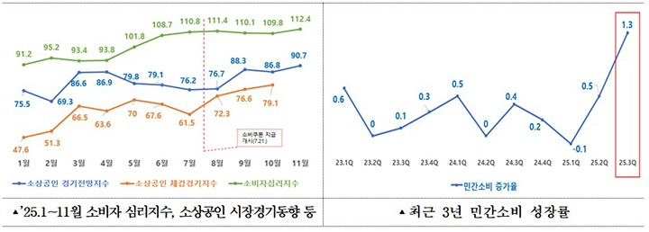 한국은행이 발표한 '민간소비 증가율' 역시 2025년 1분기와 2분기에 각각 - 0.1%와 0.5% 수준에 머물렀으나, 소비쿠폰 지급 이후인 3분기에 1.3%를 기록해 2022년 이후 3년 만에 최고 수준을 보였다.