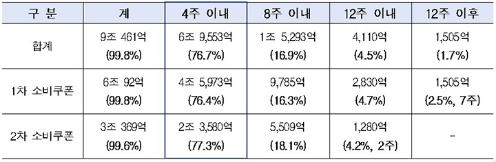 특히 1·2차 모두 지급 개시 후 4주 이내에 지급액의 75% 이상이 사용되고, 8주 이내에 90% 이상이 사용되는 등 국민들의 신속한 사용이 있었다.