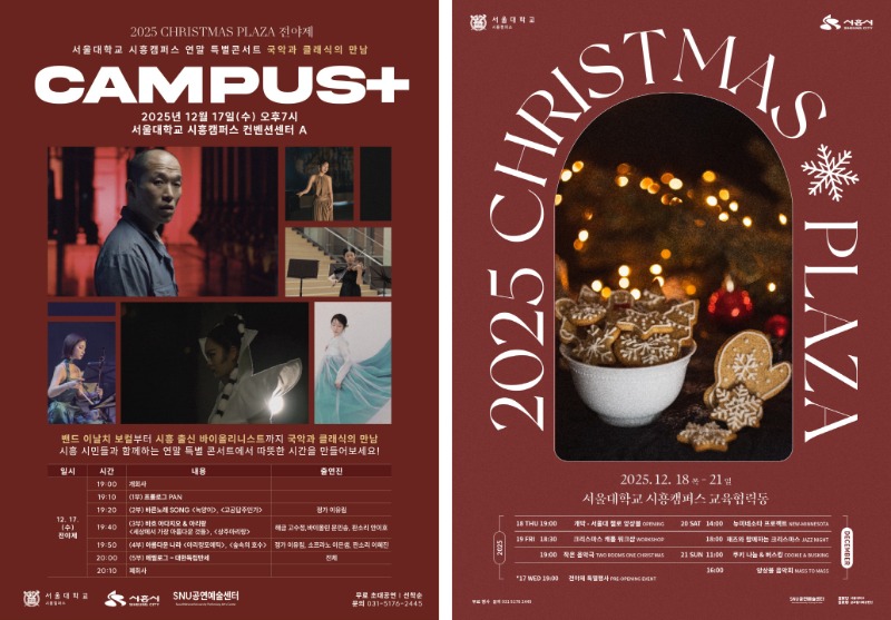 [kbn연합방송=김진영 기자] 시흥시(시장 임병택)와 서울대학교 시흥캠퍼스가 오는 12월 17일부터 21일까지 특별 행사인 ‘2025 크리스마스 플라자(CHRISTMAS PLAZA)’를 개최한다. 올해 행사는 단 하루만 열리는 전야제 특별콘서트 ‘캠퍼스 플러스’를 중심으로, 국악과 클래식을 대표하는 최정상급 연주자들이 한자리에 모여 연말 분위기를 고조시킬 예정이다.