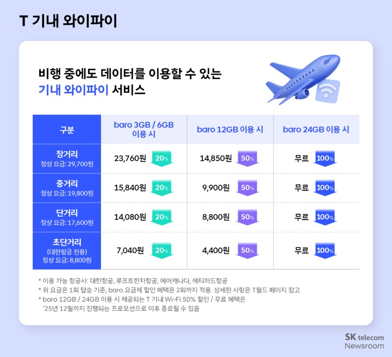 비행기 안에서부터 끊김 없는 통신 서비스를 원한다면 비행 중에도 데이터를 이용할 수 있는 기내 Wi-Fi 서비스, ‘T 기내 와이파이’를 추천한다. 요금은 초단거리, 단거리, 중거리, 장거리 등 거리에 따라 달리 적용된다. baro 요금제 고객은 연말까지 T 기내 와이파이를 할인가에 이용할 수 있다. 가입 요금제에 따라 T 기내 와이파이 20%(baro 요금제 3GB·6GB 사용 시) 할인부터 최대 2회 무료(baro 요금제 24GB 사용 시) 이용권이 주어진다. baro 요금제와 T 기내 와이파이 조합이면 여행의 시작부터 끝까지 끊김 없이 통신 서비스를 즐길 수 있다.
