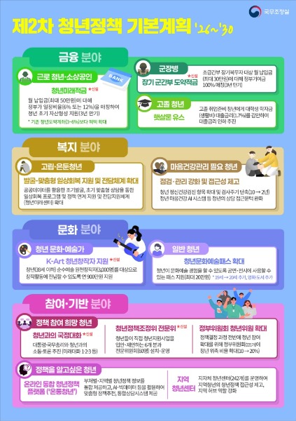 제2차 청년정책 기본계획 분야・대상별 주요과제(금융/복지/문화/참여・기반).(국무조정실 제공)