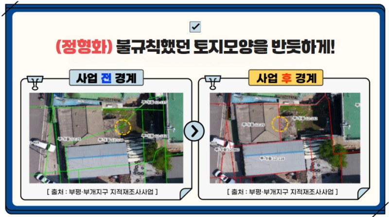 그 결과 ▲형상이 불규칙한 토지 2만 4,028필지를 반듯한 형태로 정형화했고 ▲건축물이 타인의 토지를 침범해 분쟁 소지가 있던 1만 1,474필지의 경계를 바로잡았다. 또한 ▲도로와 인접하지 않던 맹지 1,481필지를 도로에 접하도록 조정해 시민 불편을 해소한 것으로 나타났다.
