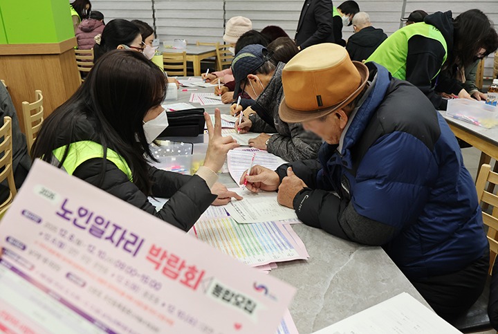 부산 남구청에서 열린 '부산 남구 2026 노인 일자리 박람회'에서 구직을 희망하는 어르신들이 직원의 도움을 받아 신청서를 작성하고 있다. 2025.12.8 (사진=저작권자(c) 연합뉴스, 무단 전재-재배포 금지)