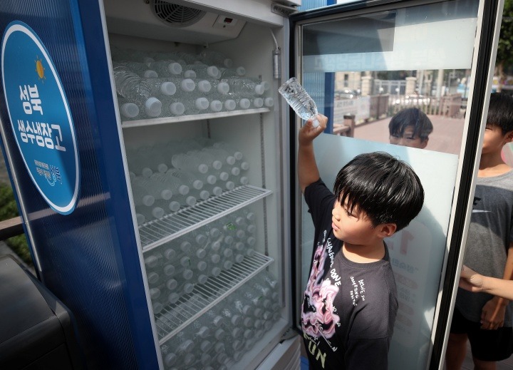 서울 성북구 바람마당에 설치된 '생수 나눔 냉장고'에서 학생들이 무라벨 생수를 꺼내고 있다. 2024.7.14. (ⓒ뉴스1, 무단 전재-재배포 금지)