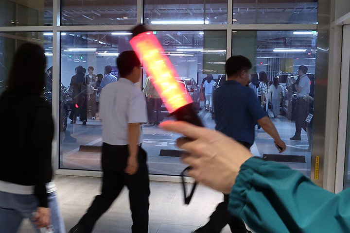 전국에서 공습 상황을 가정한 민방위 훈련 공습경보 사이렌이 울리자 정부세종청사 직원들이 중앙동 지하 주차장으로 대피하고 있다. 2025.8.20 (사진=저작권자(c) 연합뉴스, 무단 전재-재배포 금지)