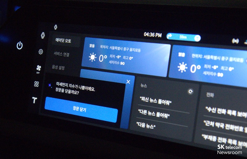 만약 미세먼지 지수가 좋지 않은 상황에서 창문을 열고 주행 중일 경우, 에이닷 오토는 단순히 수치를 알려주는 데서 그치지 않고 상황에 맞는 추가 조치까지 제안한다. 현재 주행 환경을 고려해 창문을 닫는 것이 좋다는 안내와 함께 화면에는 ‘창문 닫기’ 선택 팝업이 표시된다. 이때 화면의 버튼을 누르면 창문이 즉시 닫히며, 버튼을 누르지 않더라도 “창문 닫아줘”와 같은 음성 명령만으로도 창문을 자동으로 닫을 수 있다.