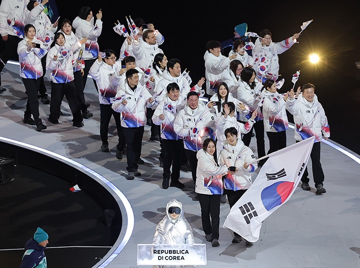 올림픽 발상지 그리스에 이어 각국 선수단이 이탈리아어 알파벳 순서로 입장했고, 한국은 92개 국가올림픽위원회(NOC) 가운데 22번째로 트랙을 밟았다. 피겨 차준환과 스피드스케이팅 박지우가 대형 태극기를 들고 선두에 섰고, 선수들은 환호에 맞춰 손을 흔들며 천천히 첫발을 내디뎠다.