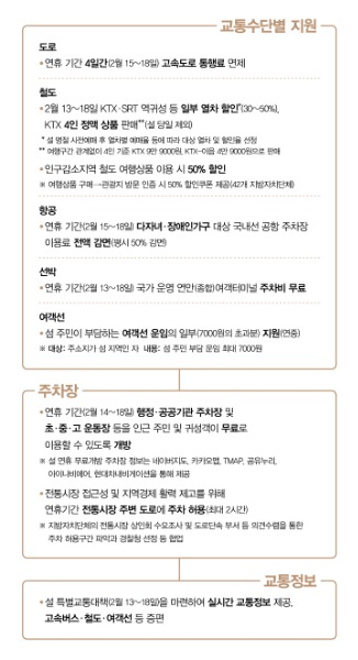 이용자 편의를 위해 2월 15일부터 18일까지 나흘간 전국 고속도로 통행료를 면제한다. 졸음쉼터와 휴게소를 확충하고 화장실과 서비스 인력을 대폭 늘린다. 철도는 역귀성 할인과 여행상품 연계 할인을 시행하고 교통약자를 위한 자동발매기와 편의물품을 확대 배치한다. 공항은 출국장을 조기 개방하고 실시간 대기 현황을 공개하며 여객선은 운항 예보와 임시주차장 확보로 혼잡을 줄인다.