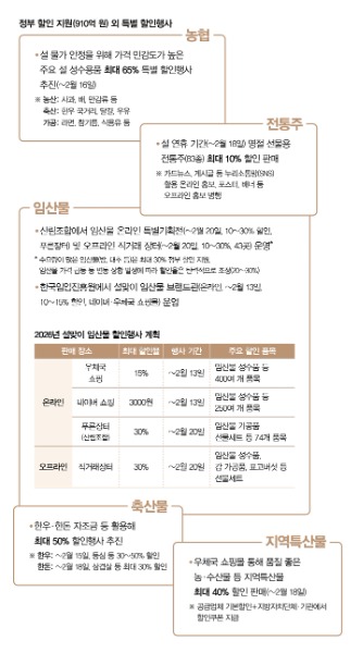 성수품 가격 할인 지원을 대폭 확대한다. 역대 최대 규모인 910억 원을 투입해 농축수산물 할인 지원에 나섰다. 온·오프라인 유통업체에서는 매주 1인당 최대 2만 원 한도 내에서 성수품을 최대 50%까지 할인하고, 전통시장에서는 온누리상품권 환급과 상품권 할인 판매를 확대한다. 선물세트는 제수용품과 과일, 한우, 수산물 등을 중심으로 최대 50% 할인 판매한다.