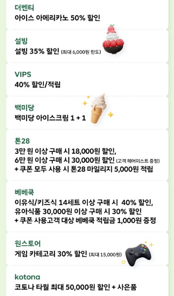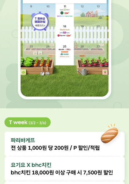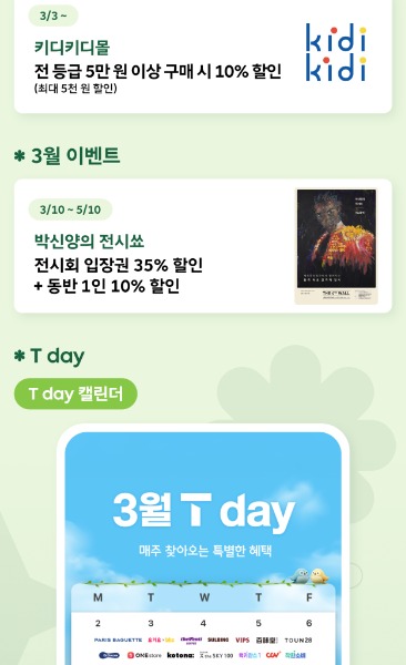 3월 T day 혜택도 다채롭게 마련됐다. 요기요xbhc 치킨 할인, 설빙 35% 할인, VIPS 40% 할인 및적립 혜택을 비롯해, 더벤티 아이스 아메리카노 50% 할인, 베베쿡과 톤28 할인까지 폭넓은 혜택을 만나볼 수 있다.
