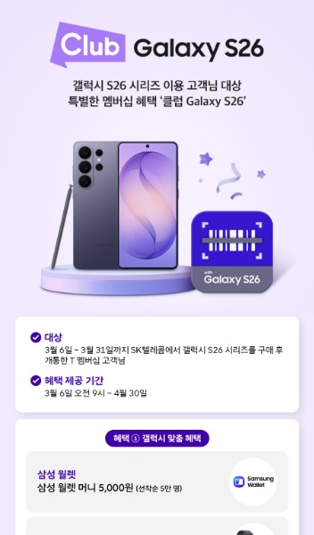SKT는 갤럭시 S26 시리즈 출시를 맞아 특별한 T 멤버십 패키지를 선보인다. 갤럭시 S26 시리즈 사전예약자를 포함해 3월 31일까지 개통을 완료한 고객 모두에게 OTT부터 일상생활 혜택까지 두루 모은 T 멤버십 ‘클럽 갤럭시 S26’ 패키지를 제공한다. 대상 고객은 3월부터 4월까지 두 달간 패키지 내 혜택들을 이용할 수 있다.