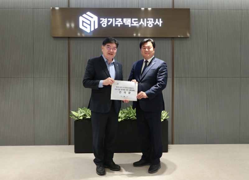임병택 시흥시장(오른쪽)과 김용진 GH사장이 공동협력 건의문을 들고 있다.