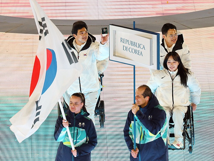 현지시간 6일 이탈리아 베로나 아레나에서 열린 2026 밀라노·코르티나 동계패럴림픽 개막식에서 국기를 든 자원봉사자와 대한민국 선수 및 임원진이 입장하고 있다.(사진=저작권자(c) 연합뉴스, 무단 전재-재배포 금지)