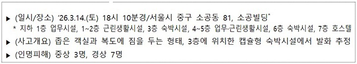 소공동 숙박시설 화재 계기…"숙박시설 이용 국내·외 방문객 안전 최우선"