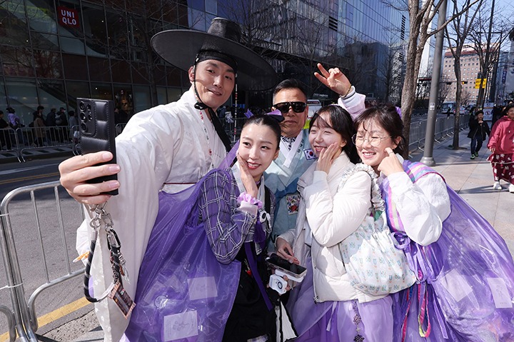 방탄소년단(BTS) 컴백 공연일인 21일 서울 광화문광장 인근에서 한복을 입은 아미들이 기념촬영을 하고 있다.(ⓒ뉴스1, 무단 전재-재배포 금지)