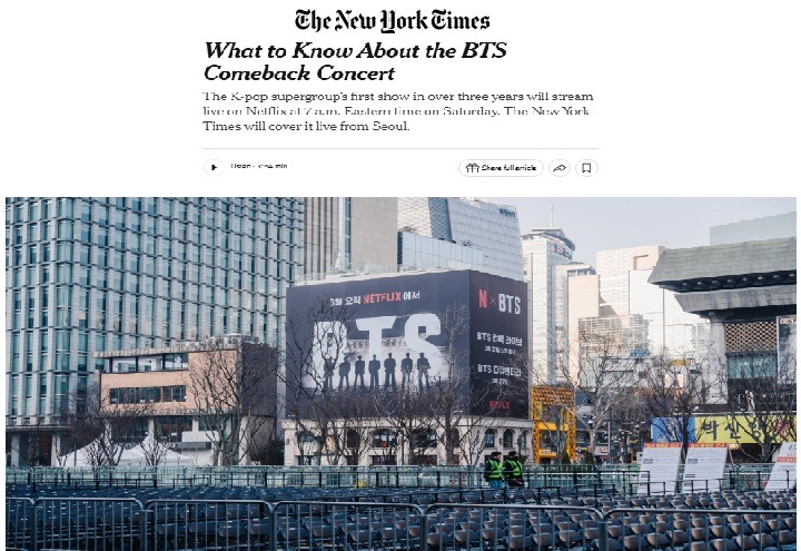 미국 뉴욕타임스는 지난 21일 이라는 제하 기사에서 "BTS의 이번 공연과 투어는 그룹뿐 아니라 한국 경제와 소프트파워 전반에도 큰 의미가 있다"고 보도했다.(이미지=뉴욕타임스 기사 캡처)