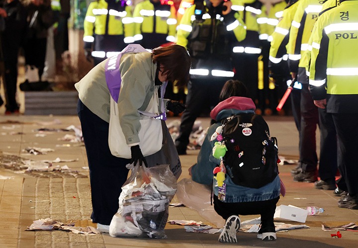 21일 오후 서울 종로구 광화문광장에서 열린 'BTS 컴백 라이브: 아리랑'이 끝난 후 한 아미 자원봉사단원이 쓰레기를 치우고 있다.(ⓒ뉴스1, 무단 전재-재배포 금지)