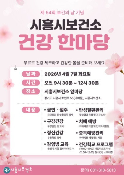 [kbn연합방송=김진영 기자] 시흥시(시장 임병택)가 오는 4월 7일 ‘제54회 보건의 날’을 맞아 시흥시보건소 앞마당에서 시민의 질병 예방과 건강 인식 제고를 위한 ‘건강 한마당 홍보관’을 운영한다.