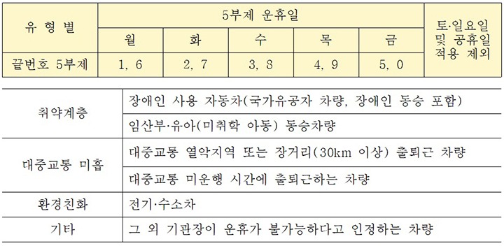 아울러 기존에는 승용차 운휴 요일을 선택하는 선택요일제 방식이 가능했으나, 이번에는 차량번호 끝자리로 운휴 요일을 지정하는 끝번호 요일제만 시행한다.